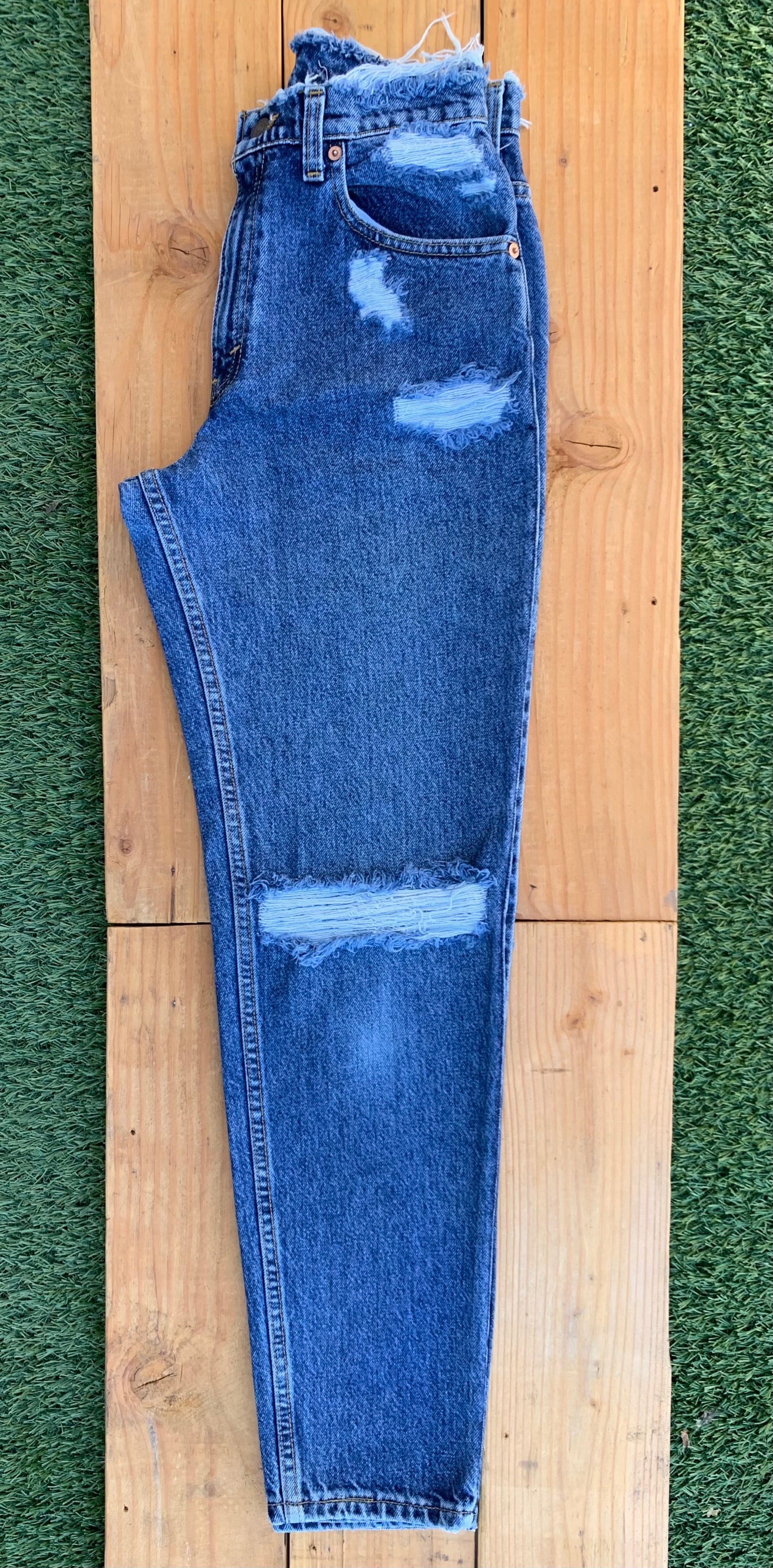 >Description: We have given this vintage jean our classic distressing that you can wear anywhere. We carefully distressed the back pockets and the front knees. Then, we frayed the waistline to make your waist look amazing when when wearing this pair! You won't want to take this jean off!